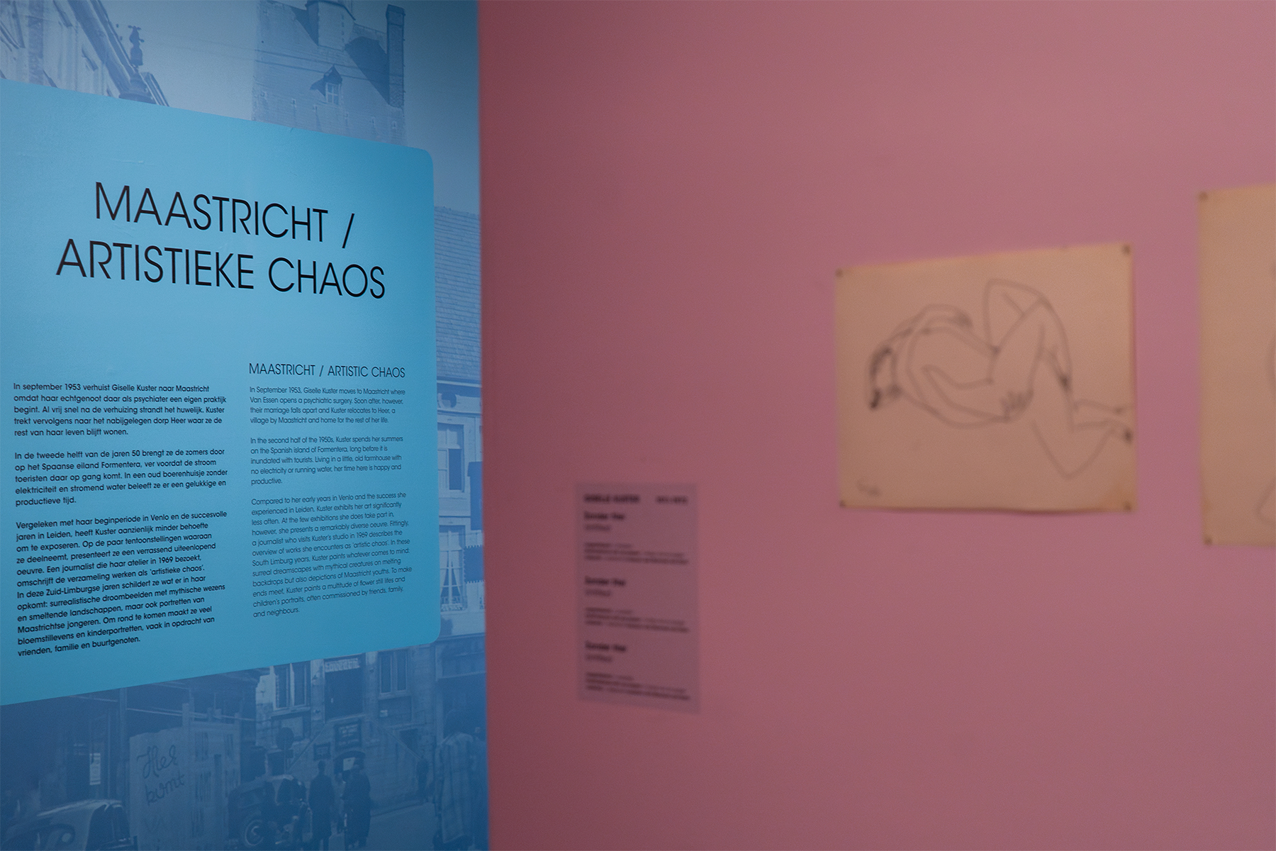 Designer Dana Dijkgraaf developed a visual concept connecting the exhibition and the accompanying book. Each period of Kuster’s life received a unique color palette tailored to the works of that time. Historical photographs of key locations were enlarged and presented as duotone wall prints, creating a spatial and immersive experience. Texts were printed on colors harmonizing with the exhibition palette, using Avant Garde for body text due to its experimental connection to Kuster’s work, and a warm rounded typeface for titles reflecting her character.