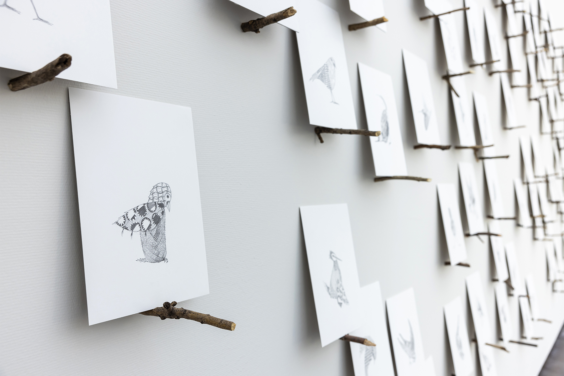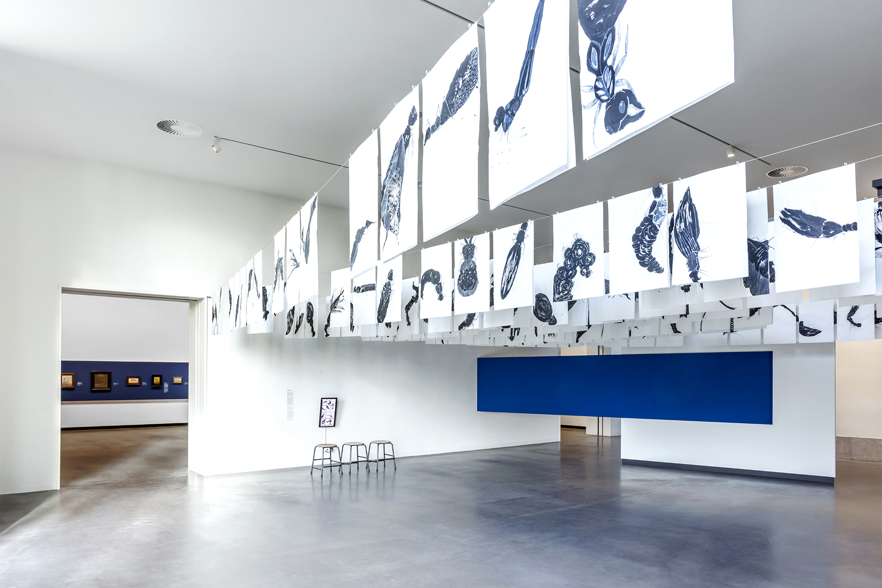 The exhibition presented Mankes’ works on a continuous deep blue band running along the walls, while contextual artworks by other artists were displayed against a lighter blue background. This contrast created a clear visual distinction while maintaining harmony throughout the exhibition. The blue framing helped visitors focus on Mankes’ intimate paintings, many of which are remarkably small in scale. The detailed painting of a kestrel, measuring only fifteen by fifteen centimeters, encouraged visitors to step closer and engage with the artwork in a more personal way.