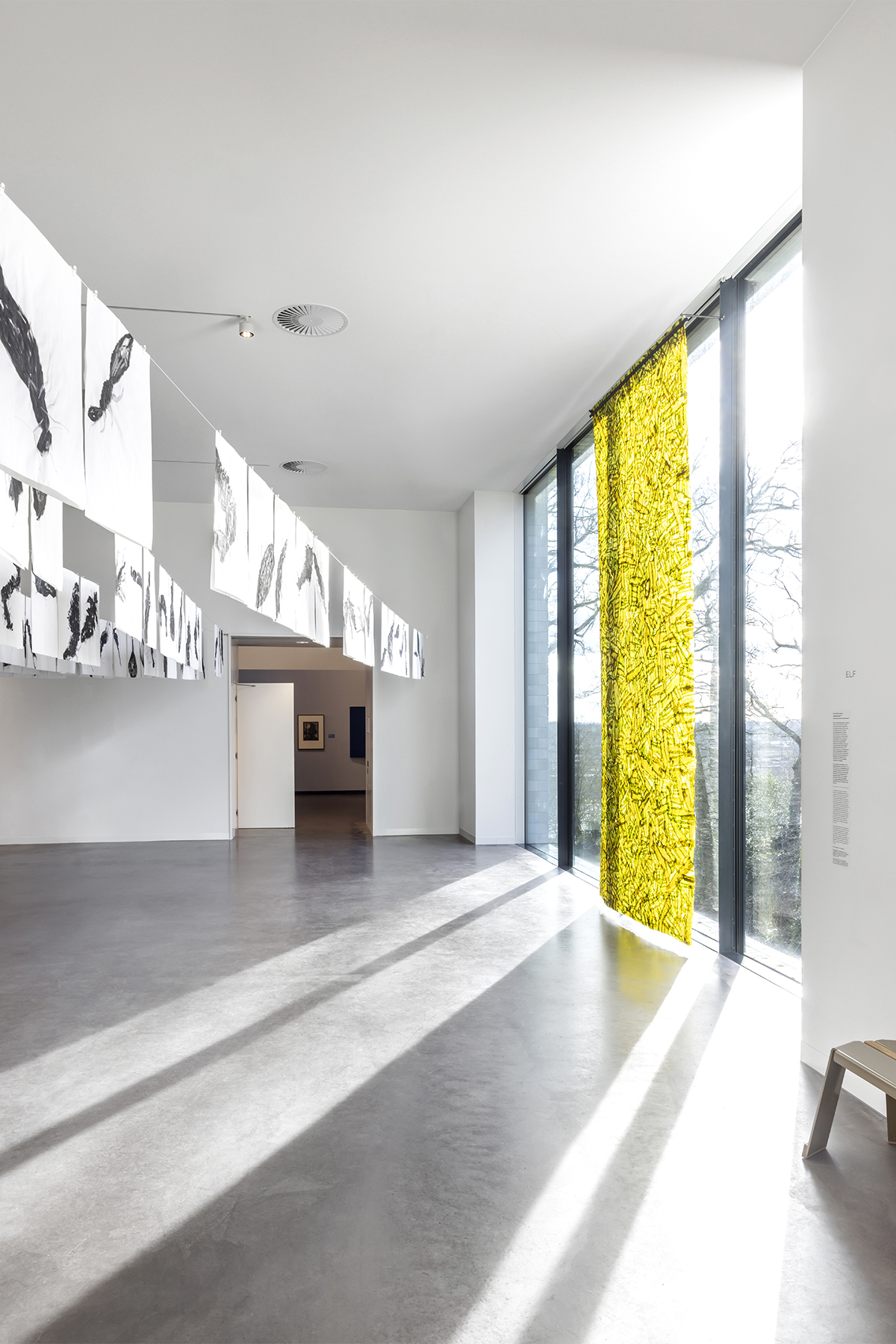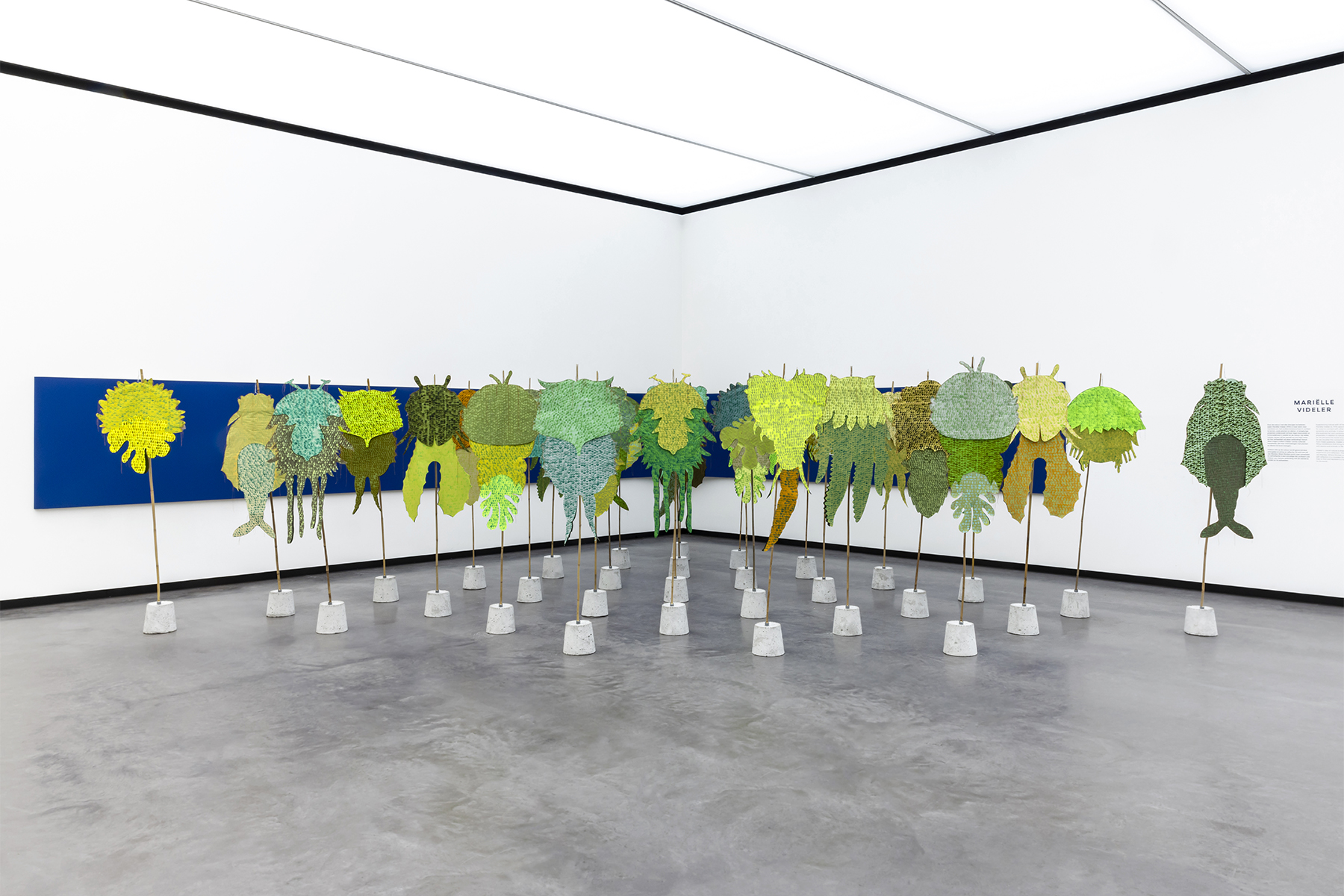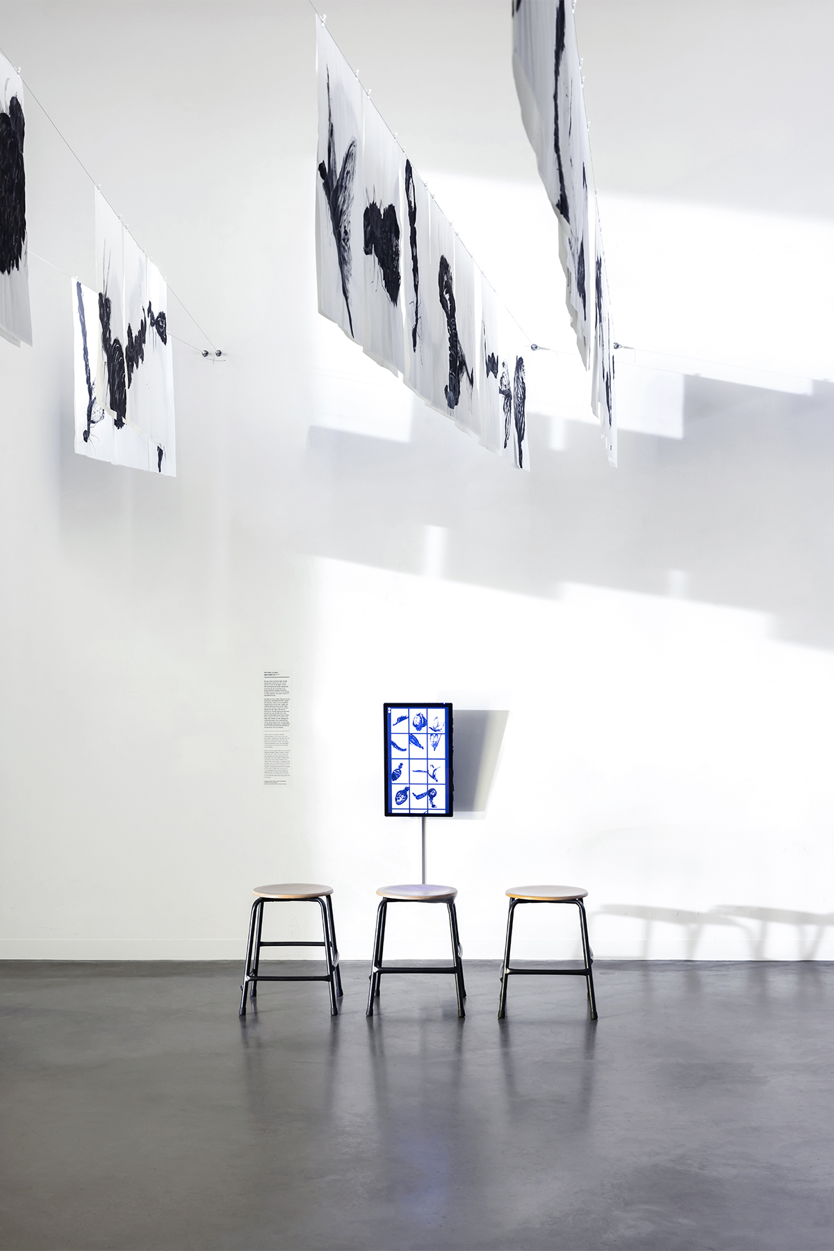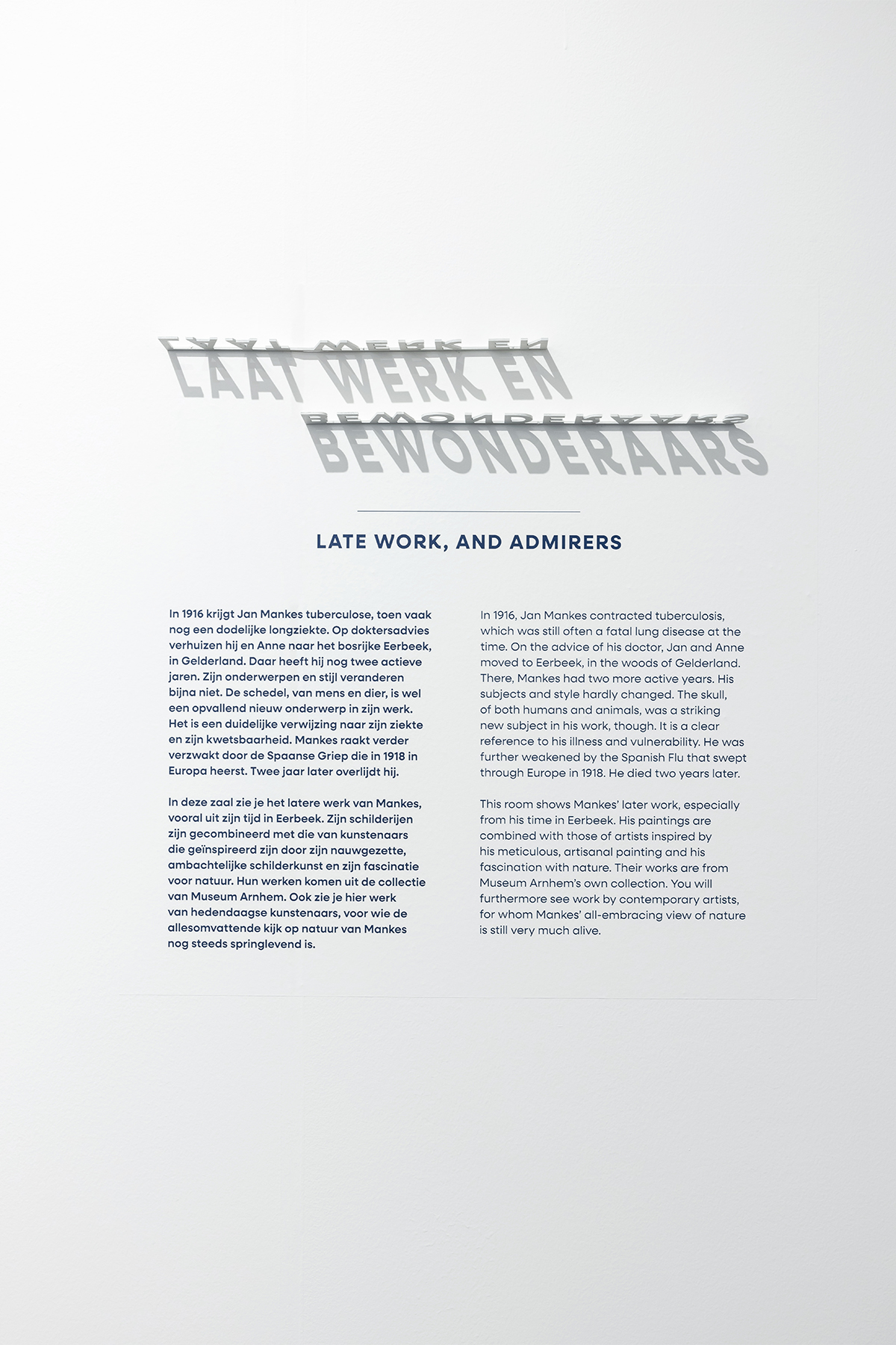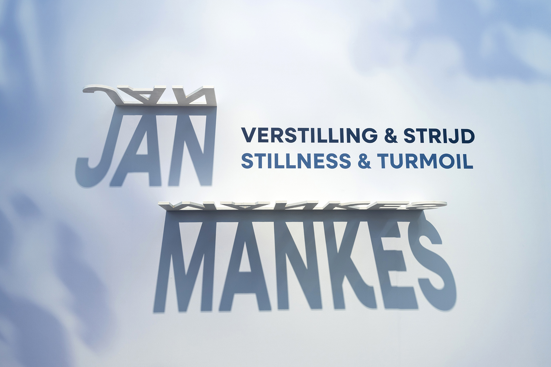 Where the different shades of blue met, soft gradients were introduced to create smooth transitions between Mankes’ work and the contextual pieces. Shadows played an important conceptual and visual role. Physical typography was designed to exist only through the presence of light, forming words through cast shadows. Additional subtle wall elements introduced soft plant shadows, reinforcing the connection between Mankes’ art and the natural world. A friendly and slightly curved typeface was chosen to echo the gentle and human character of Mankes’ work and personality.